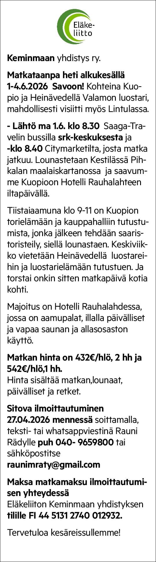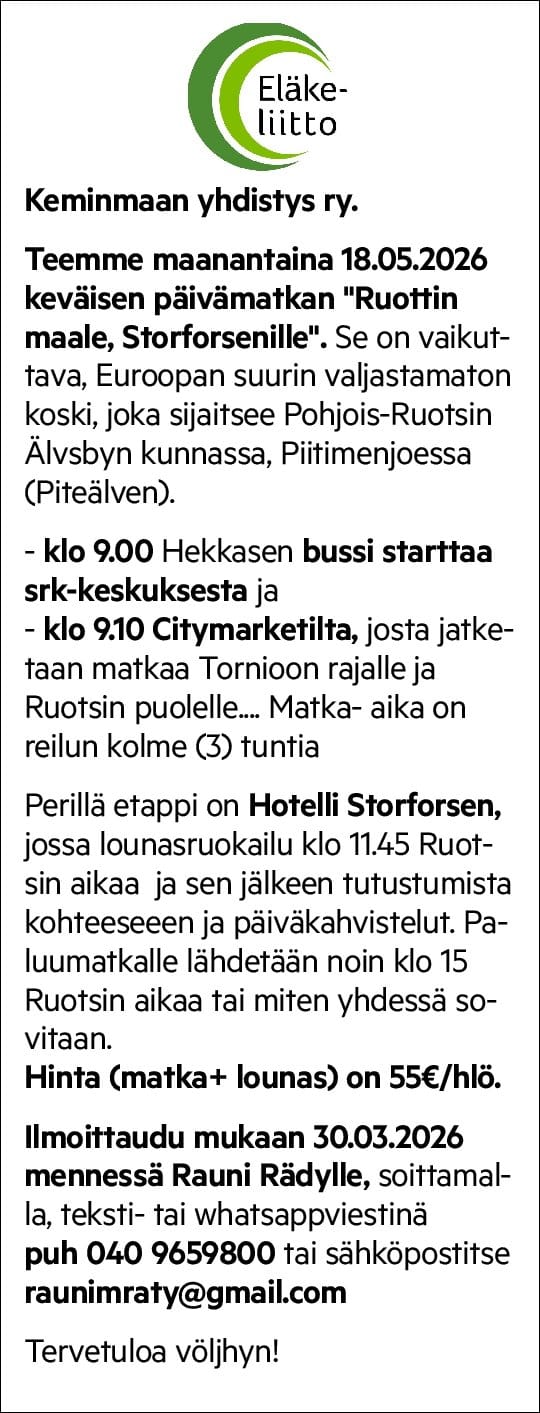 22-paikkainen Hekkasen minibussi lähtee kakkosautona Storforsenille. Ja reissun hintajan on siis 55€/hlö (matka+lounas). Maksu 30.04.2026 mennessä EL Keminmaan yhdistyksen tilille FI44 5131 2740 012932.